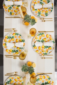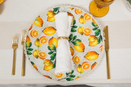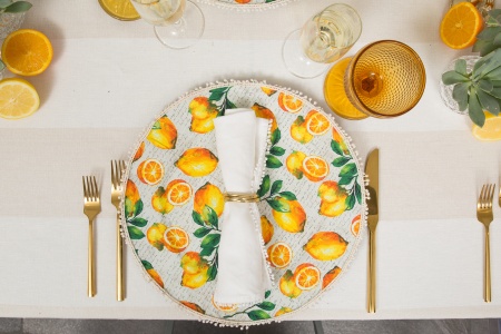 Custom made in house and very unique our Lemora Fabric Charger is a fun focal point to add to your tablescape. Create a fun sophisticated lemon themed table, pairs nicely with our Vintage Amber or Green Goblets.