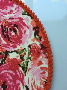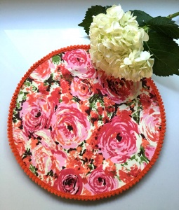 - 13" Melaminie charger with custom pink garden fabric overlay with delicate pompom trim.