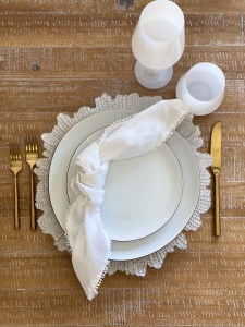 Our starburst glass charger in pearl finish is available for wedding and event rentlas in Los Angeles County, Riverside County, Ventura County, San Bernadino County and Ventura County, County of Santa Barbara.