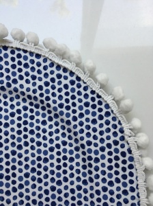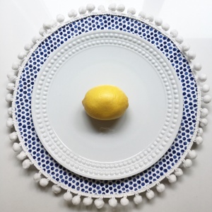 - 13" Blue and White dotted cotton charger with delicate pompom trim